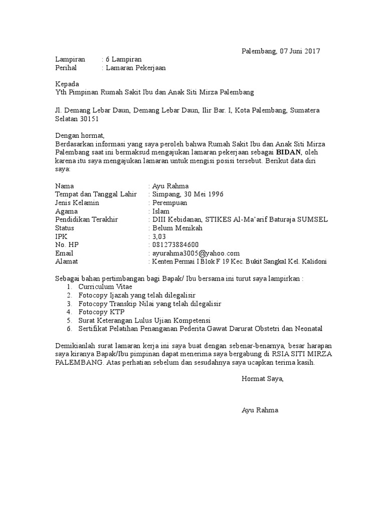 contoh surat permohonan magang pribadi, contoh cv magang ... from i.pinimg.com Contoh surat lamaran kerja menjadi bidan ini dapat anda gunakan untuk melamar pekerjaan di berbagai tempat yang membuka lowongan pekerjaan mengenai bisan yang biasanya tersebar hampir di seluruh indonesia yang membutuhkan jasa sebagai bidan di setiap klinik atau rumah sakit ternama. Dokument yang selalu wajib dalam pelamaran kerja iyalah surat lamaran karena sebagai dasar kelengkapan dokument dokument lainnya. Surat lamaran kerja merupakan salah satu syarat untuk mendapatkan pekerjaan yang ingin anda dapatkan. Saya mendapatkan informasi terkait adanya penerimaan karyawan baru dengan posisi bidan, maka berikut saya. Contoh surat lamaran kerja untuk perusahaan swasta. Dan hal ini juga bisa jadi terjadi pada beberapa perusahaan swasta dalam negeri. Membuat surat lamaran kerja di bank juga bisa dibuat singkat. Bermaksud untuk mengajukan lamaran pekerjaan di klinik sehat semua jakarta barat sebagai tenaga medis bidan.